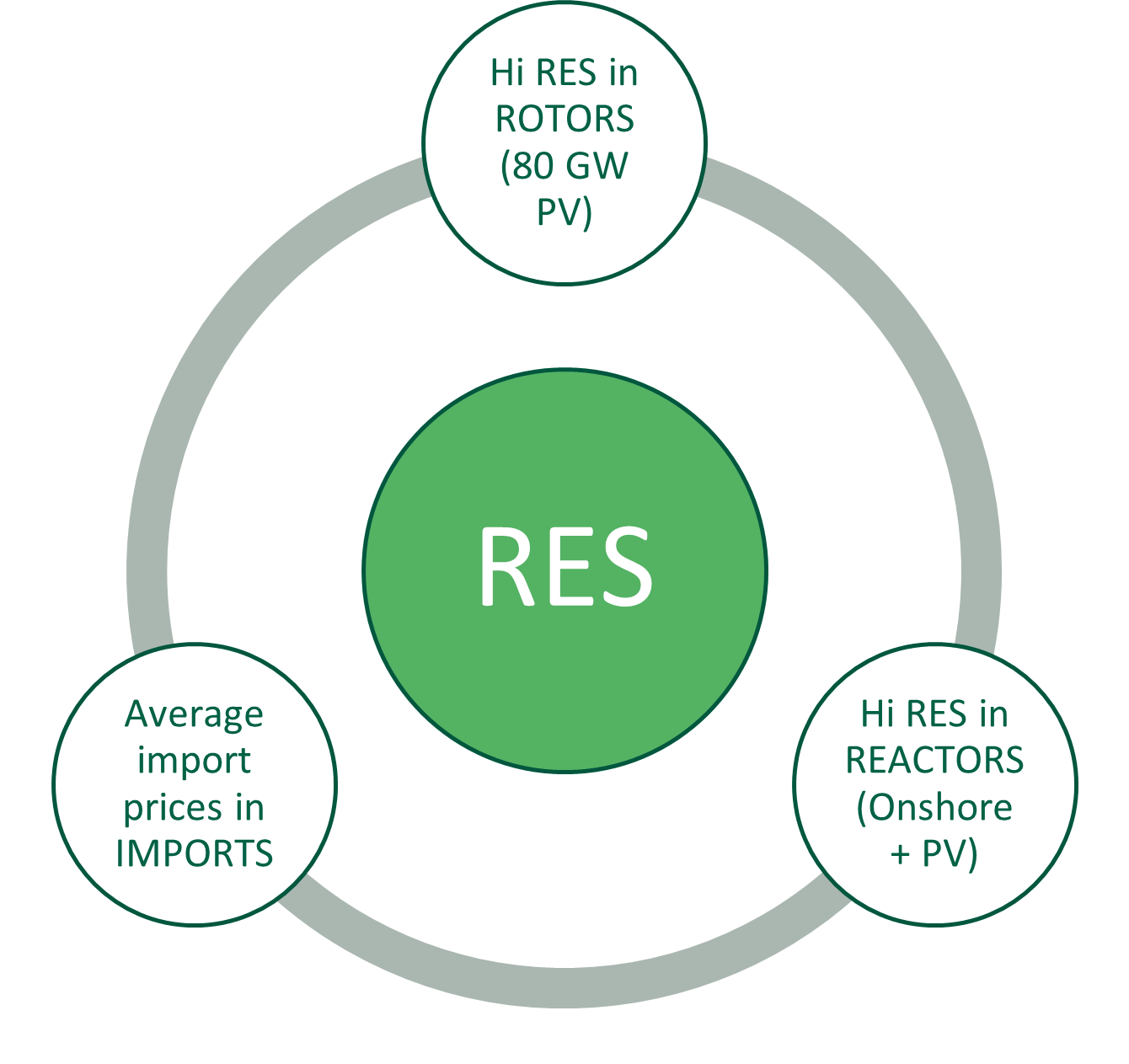 For renewables (RES), sensitivities include the HiRES case with 20 GW onshore wind and 80 GW solar PV enforced by 2050. Another sensitivity relates to the IMPORTS scenario. Here, we examined the impact of applying average molecule import prices, as used in ROTORS and REACTORS, rather than the previously assumed low prices that were based on strong global growth in the hydrogen market.